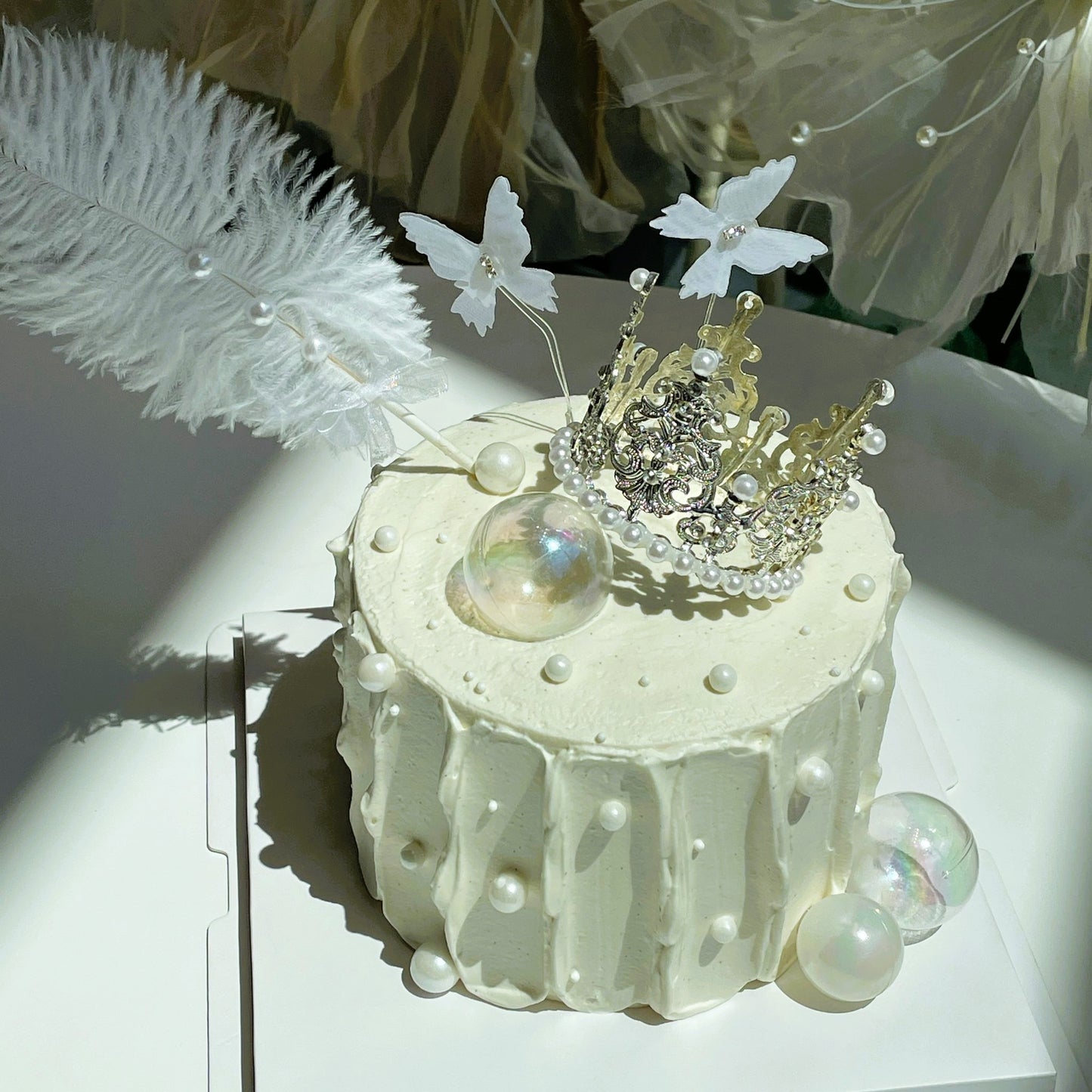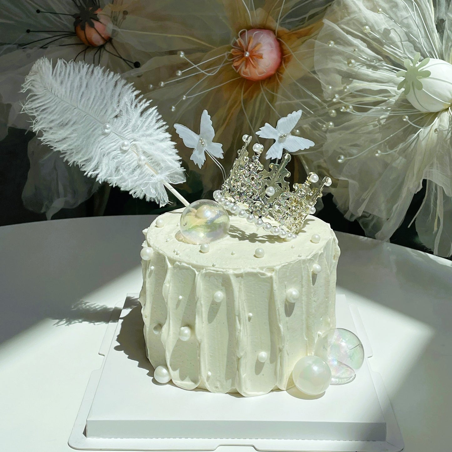 A vision of elegance and grace, this white cake is a fairytale come to life. Topped with a delicate crown, it exudes regal charm, while soft feathers and shimmering pearls add a touch of ethereal beauty. Whisper-light butterflies dance above, creating a dreamlike atmosphere. Perfect for queens of all ages!