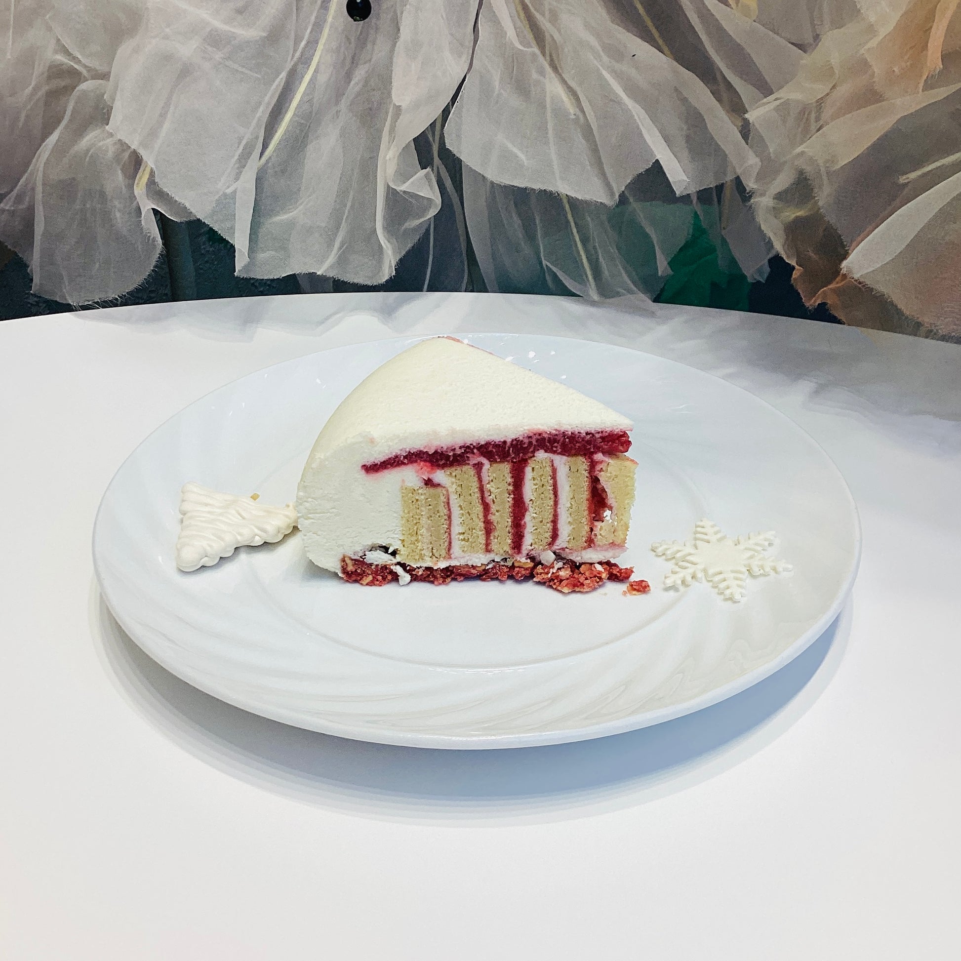 A delicate celebration of winter’s sweetness, this enchanting cake begins with an almond raspberry crunchy base, adding a vibrant, tangy crisp to every bite. Above it rests a silky yogurt mousse, light as fresh snowfall, embracing a bright strawberry compote at its heart. A tender vanilla sponge provides warmth and balance, bringing the flavors together in perfect harmony.