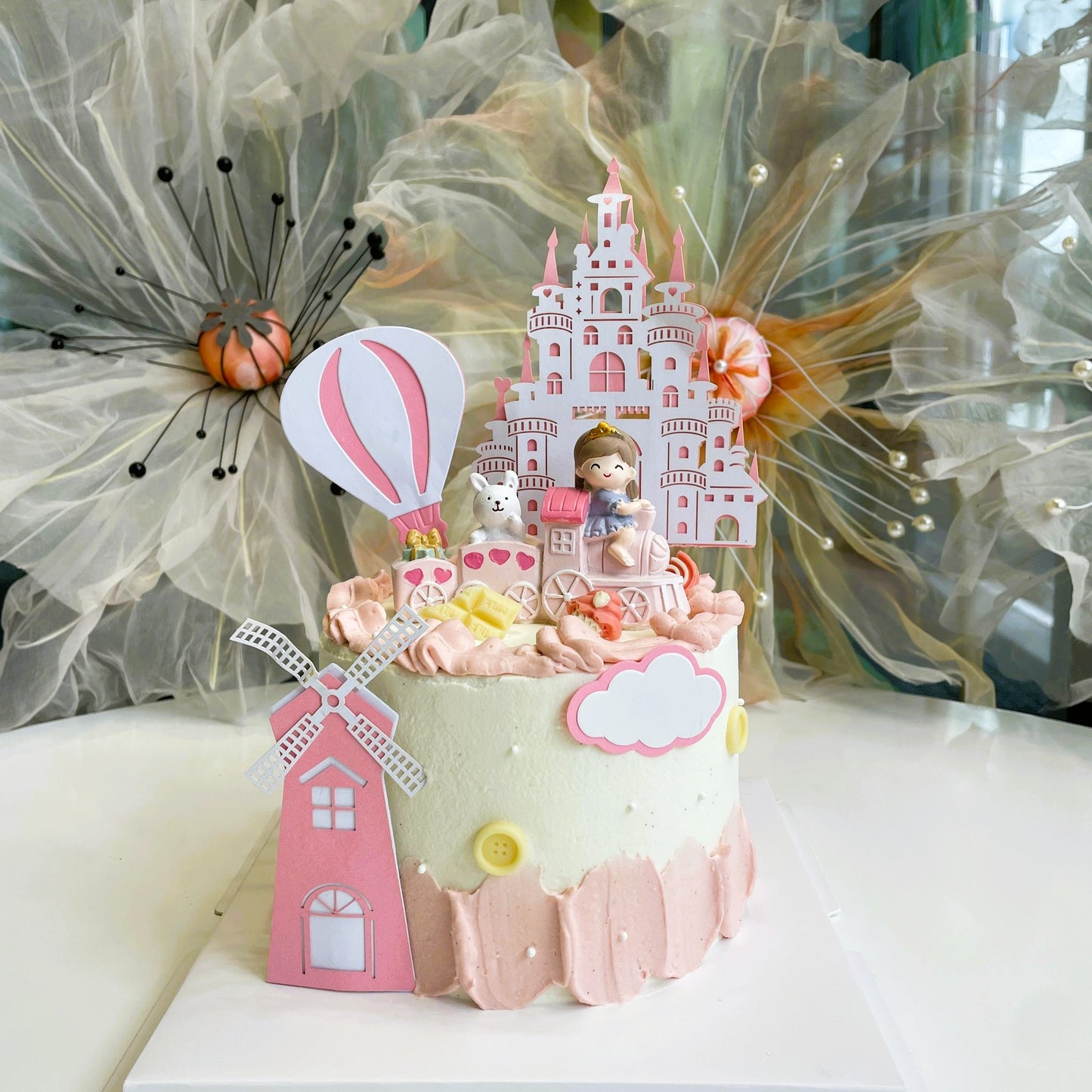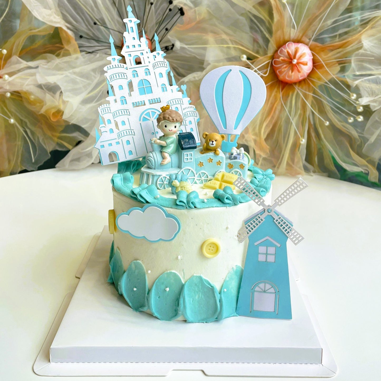 Note: Train figurine and paper decorations (castle, parachute, windmill, cloud) are not edible